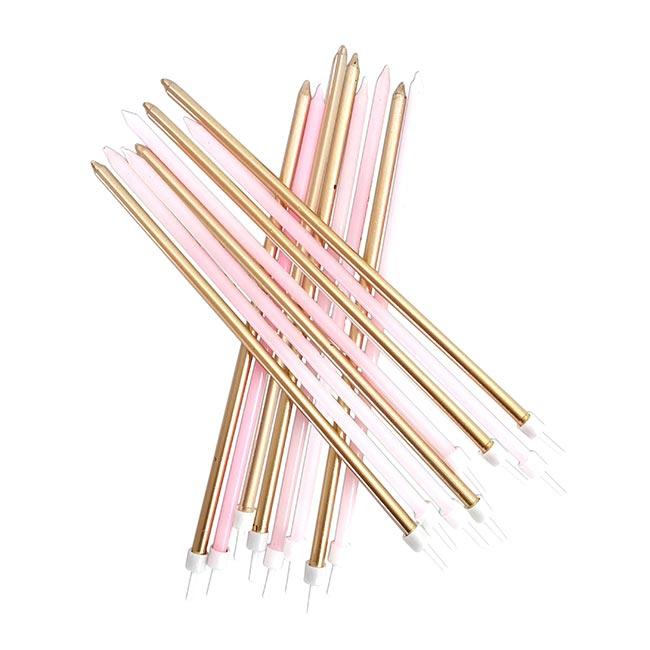 Lange Kerzen "Rosa und Gold" mit Halterung 16er Pack