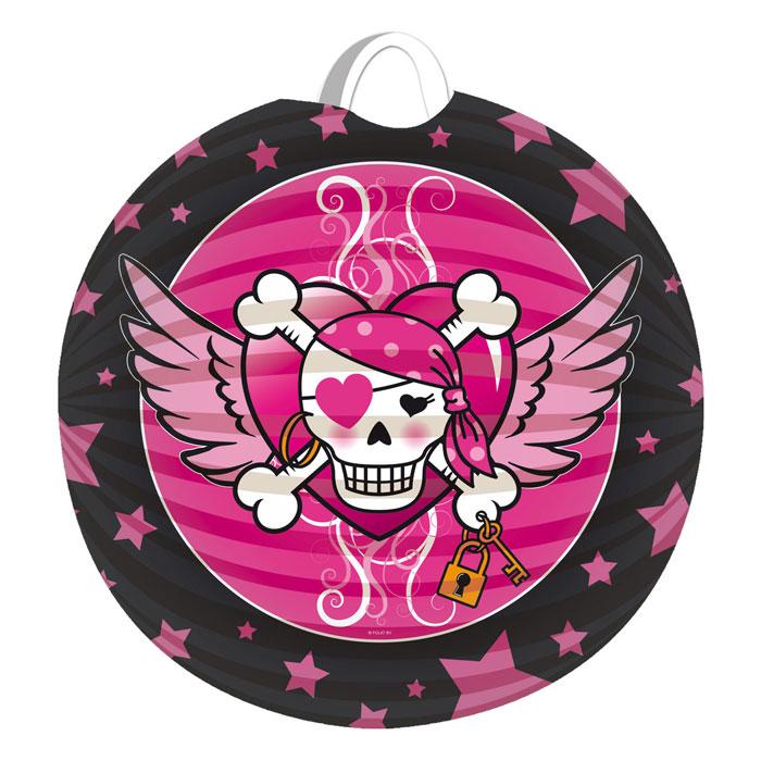 Ich geh mit meiner Laterne..- tolle Laterne aus der "Pirate Girl" Serie für eine Piraten-Mottoparty oder sogar zu Sankt Martin. Die Laterne ist rund und misst einen Durchmesser von ca 22cm. Das Motiv ist ein weiblicher Totenschädel, der mit rosafarbenen Flügeln geschmückt ist und im Hintergrund ein pinkes Herz hat, sowie ein schwarzer Hintergrund mit kleinen pinken Sternchen. Am oberen Teil hat die Laterne eine Halterung, sodass sie im Raum als Dekoration angebracht werden kann, oder ein Leuchtstab drangemacht werden kann.Sie ist aufklappbar und besteht aus robustem Papier.