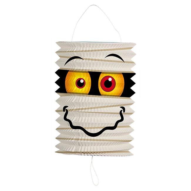 Die Laterne "Verrückte Mumie" hat entfaltet eine Höhe von ca. 19 cm und einen Durchmesser von ca. 15,5 cm. Sie ist aus Papier und auf ihr ist das Gesicht einer Mumie abgebildet. Boden und Decke der Laterne sind mit Pappe verstärkt. Für die Befestigung ist ein Metalldraht angebracht. Die Laterne wird gefaltet geliefert und muss selbst entfaltet werden.