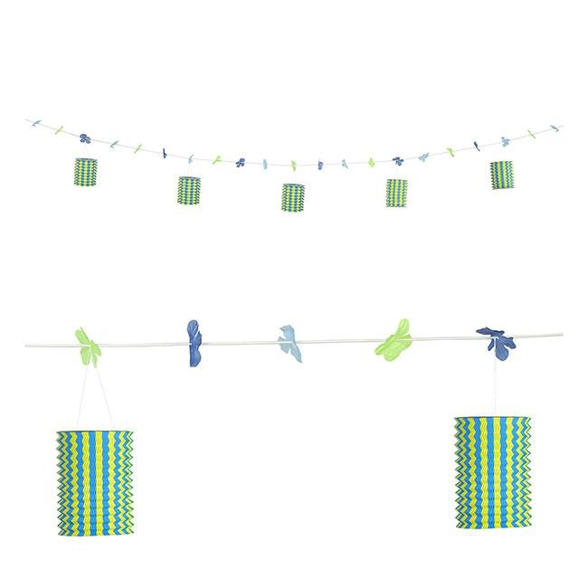 Die Girlande hat eine Länge von ca. 3 cm und besteht aus insgesamt fünf Laternen, die einen Durchmesser von ca. 10 cm und eine Höhe von ca. 20 cm haben. Sie ist in den Farben grün -gelb (zusätzlich blau, türkis), orange (zusätzlich pink, gelb) oder blau-grün (zusätzlich türkis) erhältlich.