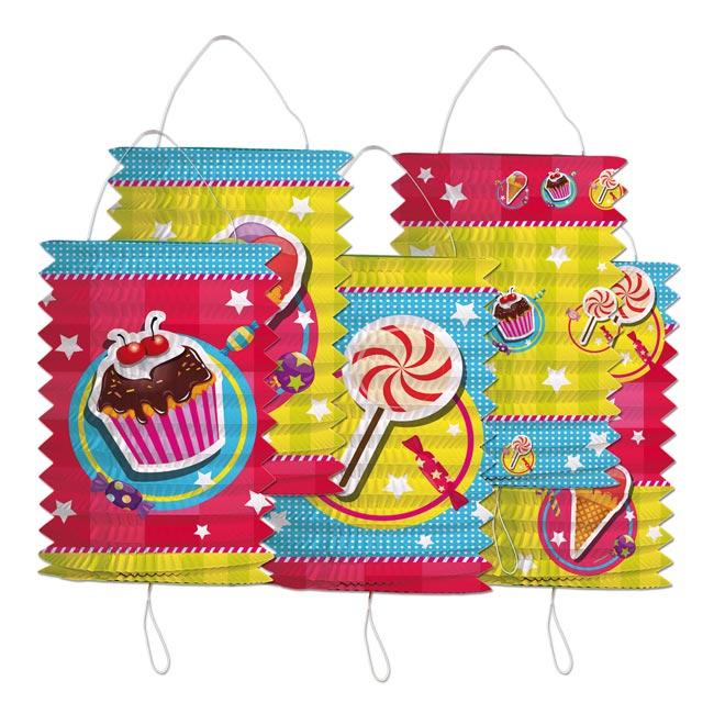 Das Laternen Set "Candy" besteht aus 5 verschiedenen Papier-Laternen die alle einen Durchmesser von ca. 15,5 cm und entfaltet eine Höhe von ca. 19 cm. Die Laternen verfügen über eine Schnur an der Unterseite, und einen Draht an der Oberseite. Mit deren Hilfe können die Laternen leicht entfaltet werden. Jede Laterne ist mit bunten Süßigkeiten bedruckt. Eine Halterung für Kerzen ist nicht vorhanden, natürlich können die Laternen aber mit Lichterketten beleuchtet werden.