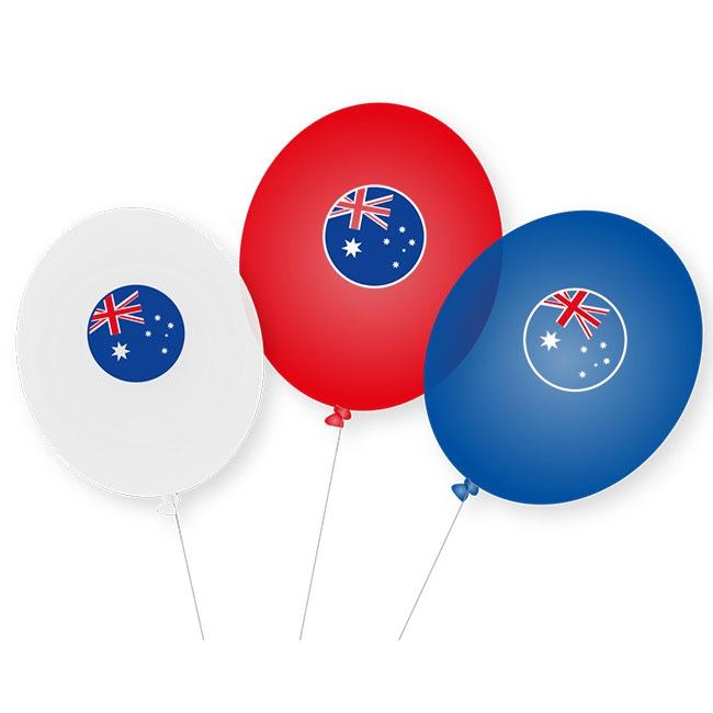 Die Luftballons "Australien" bestehen aus Latex und werden im 9er Pack geliefert. Drei der Ballons sind blau, drei weiß und die restlichen drei rot. Alle sind mit der australischen Flagge bedruckt.