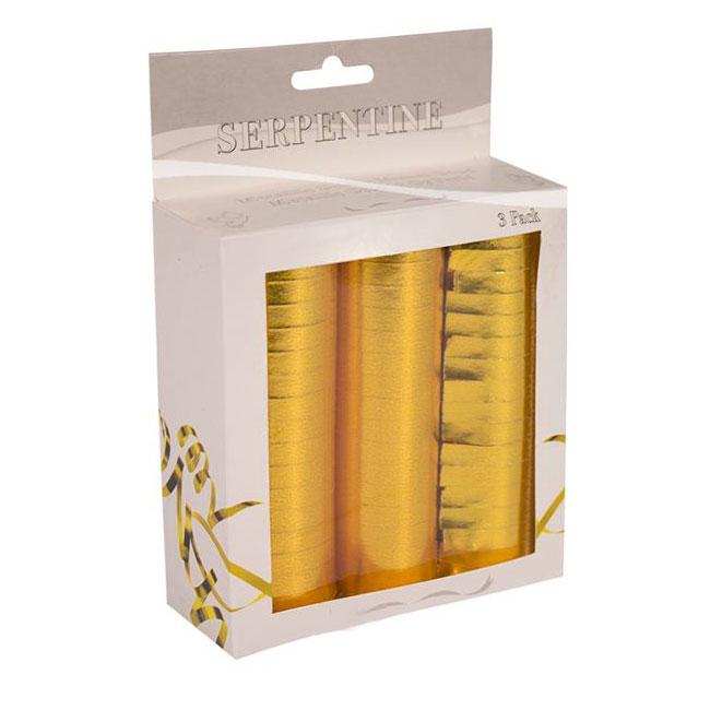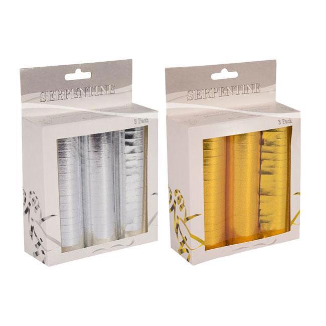 Mit diesen glamourösen Metallic-Luftschlangen kann man ganze Räume dekorieren. Sie passen ganz besonders toll zu glamourösen Veranstaltungen oder zur Gold- bzw. Silberhochzeit. Aber auch zu Silvester oder anderen Anlässen und Veranstaltungen sind sie ein absolutes Muss. Die Luftschlangen gibt es in Gold oder Silber. Sie werden im 3er Pack geliefert, jede Luftschlangen-Reihe besteht dabei aus 18 einzelnen Luftschlangen. Diese haben eine Länge von ca. 4 m.