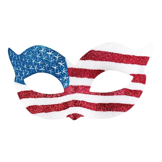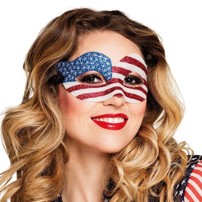 Die Maske "Amerika" besteht aus Kunststoff und wird mit einem Gummiband am Hinterkopf fixiert. Richtig glamourös sieht die amerikanische Flagge auf der Vorderseite aus. Diese ist komplett aus farbig passendem Glitzer gestaltet. Während der rote und blaue Glitzer stark funkelt, ist der weiße Glitzer eher matt. Der Innendurchmesser der Maske beträgt ca. 16 cm, die Höhe liegt bei ca. 7,5 cm. Es handelt sich um eine Einheitsgröße für Erwachsene.