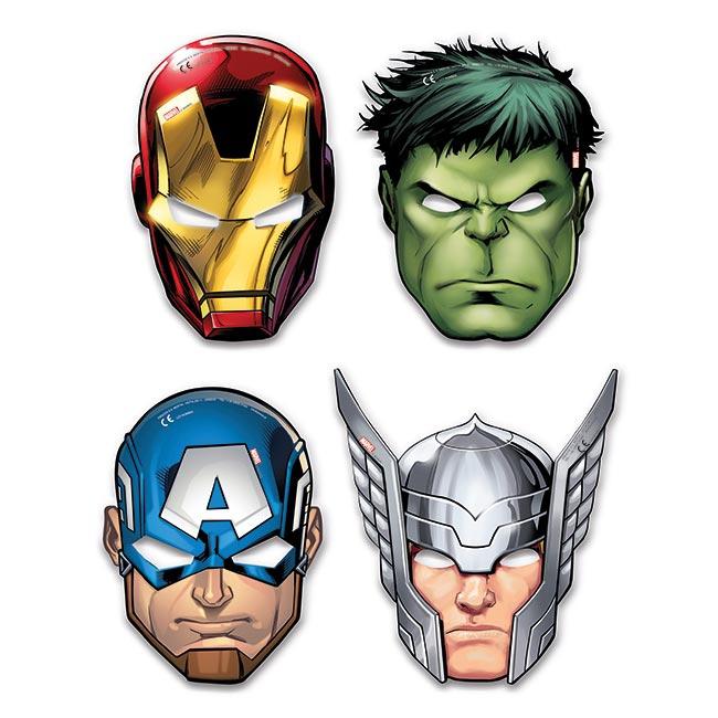 Die Masken "Mächtige Avengers" werden als 6-teiliges Set geliefert. Sie bestehen aus einseitig bedruckter Pappe und werden mit einem Gummiband getragen. Pro Packung ist das Motiv Thor und Captain America jeweils einmal enthalten, Hulk und Iron Man sind zweimal enthalten. Die Größen der Masken variieren zwischen ca. 14,5 x 22 cm (Iron Man) und ca. 19,5 x 22 cm (Thor).