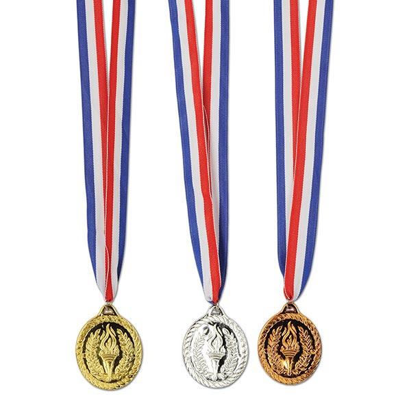Das Medaillen-Set "Stolzer Sieger" wird 3-teilig geliefert. Im Set enthalten sind eine Bronze-Medaille, eine Silber-Medaille und eine Gold-Medaille. Die Medaillen haben jeweils einen Durchmesser von ca. 5,2 cm. Befestigt sind sie an einem Band aus Polyester in den Farben Rot-Blau-Weiß.