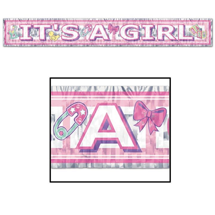 Mehr Info: Das Banner ist in einzelne metallisch-glänzende Streifen geschnitten und bewegt sich dadurch leicht bei jedem Luftzug. Kleine Symbole wie ein Entchen, ein Schleifchen oder die Baby-Rassel geben der Optik des Baby-Banners noch den letzten Schliff. Das Banner ist ca. 1,5 m lang und ca. 20,5 cm hoch.