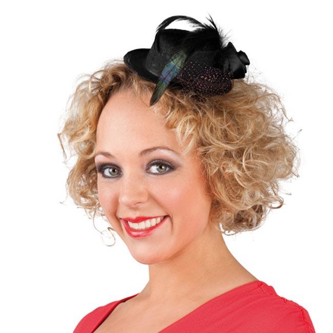 Wie bringt man nur diesen kleinen Hut am Kopf an? Mit einem Durchmesser von ca. 14 cm ist er ja nicht groß genug, damit er alleine auf einem Kopf halten kann. Als Lösung hat dieses Hütchen eine tolle Idee: Unter dem Hut befinden sich zwei schwarze kleine Klammern, mit denen Sie das Hütchen problemlos ins Haar feststecken können.