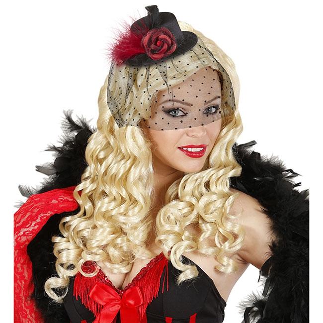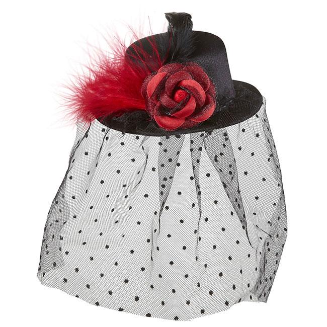 Dieser schicke Hut ist ein Mini-Hut, der mit zwei Klämmerchen an der Frisur befestigt werden kann. Sie können ihn so drapieren, wie Sie möchten. Es ist ein kleiner schwarzer Hut, der als Verzierung eine künstliche rote Rose hat. Zusätzlich hat er einen schwarzen Schleier mit schwarzen Punkten. Also das perfekte Accessoire für Ihr Burlesque-Outfit.