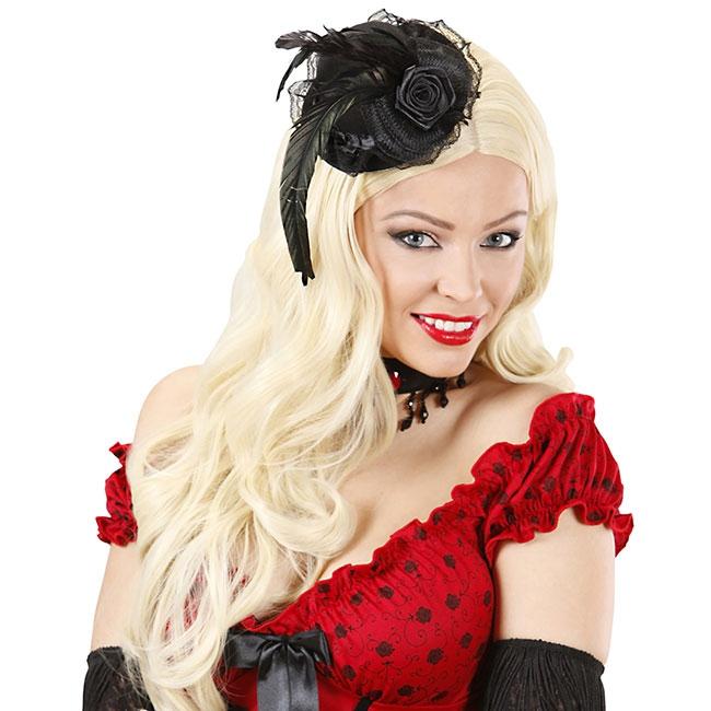 Der Mini-Hut ist komplett in schwarz gehalten und wird in einer Einheitsgröße geliefert. Er ist mit Rüschen, Spitze und Federn verziert. Das schicke Accessoires wird mit Hilfe von zwei Klammern ins Haar gesteckt und hat so einen sicheren Halt. Mit diesem Hütchen haben Sie ein tolles Accessoire was zu verschiedenen Kostümen passt.