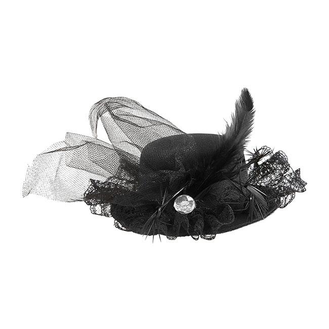 Mit diesem chicen Hütchen kann man sich richtig schaurige Kostüme zusammenstellen. Das Hütchen eignet sich bestens für ein "Schwarze Witwe" Kostüm. Es hat einen Durchmesser von ca. 13 cm und wird mit Hilfe von zwei Klämmerchen am Kopf befestigt.