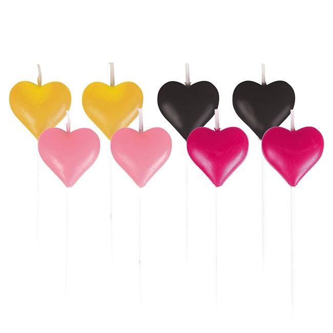 Die Mini-Kerzen "Nur du und ich" bestehen aus Kunststoff und Wachs. Im Lieferumfang sind acht Kerzen in den Farben Rosa, Gold, Pink und Schwarz enthalten. Jede Farbe ist zwei Mal vorhanden. Die kleinen Herzchen sind ca. 2,5 cm breit.