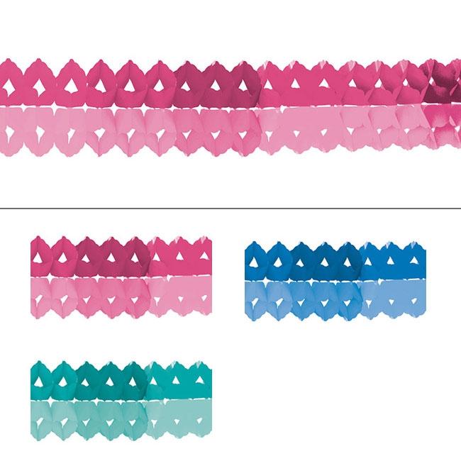 Die Mini Wabenpapier-Girlande "Colour Dream" ist ca. 2 m lang und ca. 7 cm hoch. Im Lieferumfang sind zwei Girlanden aus Wabenpapier enthalten. Abhängig von Ihrer Auswahl sind diese dann in Rosa-, Blau- oder Aqua-Türkis-Tönen gehalten.