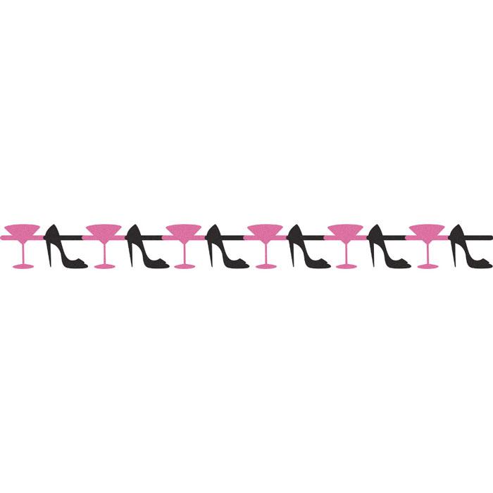 Für einen echten Weiberabend gibt es nun auch die passende Partydeko! Und was darf bei einer echten Girlie-Party nicht fehlen? Genau: SCHUHE und PROSECCO! Damit ist der Abend schon so gut wie gerettet! Diese schicke Girlande glitzert abwechselnd in Pink und Schwarz. Sie ist mit aneinandergereihten Schuhen und Prosecco-Gläsern verziert. Die Girlande hat eine Länge von ca. 167 cm, eine Höhe von ca. 15 cm und ist beidseitig bedruckt.