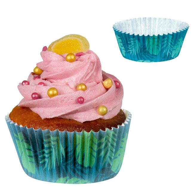 Die Muffin- und Cupcake-Förmchen "Party-Flamingo" werden im 50er Pack geliefert und bestehen aus Papier. Sie haben an der Oberkante einen Durchmesser von ca. 6,5 cm und am Boden von ca. 5,5 cm. Die Höhe beträgt ca. 3 cm. Die Förmchen sind in Blau- und Grüntönen gehalten und mit Palmenblättern bedruckt.