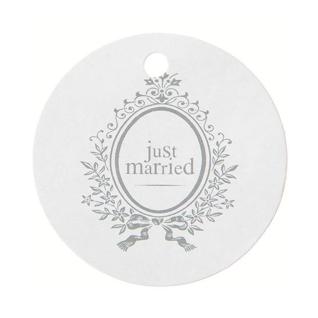 Das Namensschild "Just Married" besteht aus festerer Pappe, ist rund und hat einen Durchmesser von ca. 5 cm. Vorderseitig ist der verschnörkelte Schriftzug "Just Married" aufgedruckt, rückseitig kann beispielsweise der Name des Gastes aufgeschrieben werden. Oberseitig ist ein kleines Loch, durch welches beispielsweise eine Schleife gefädelt werden kann, welches die kreativsten Dekorationsmöglichkeiten zulässt.