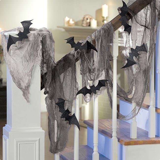 Das Netztuch hat die riesige Größe von ca. 60,9 x 457 cm. Es ist grau und ziemlich locker gewebt, somit sehr flexibel und leicht dekorierbar Im Lieferumfang sind auch 8 schwarze Fledermäuse aus Pappe enthalten, die einseitig mit schwarzem Glitzer verziert sind. Die Fledermäuse haben die Maße von ca. 25 x 8 cm und müssen selbst im Netz angebracht werden.