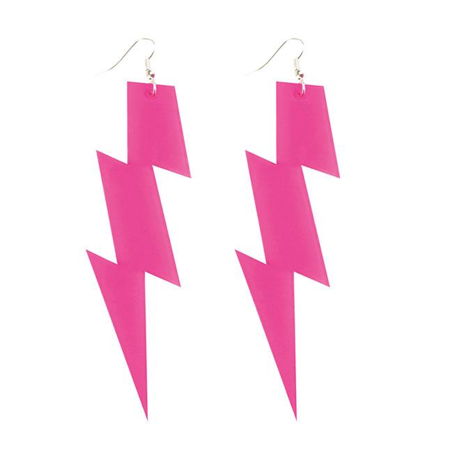 Die Kunststoff Ohrringe "Pinker Blitz" haben eine Länge von ca. 10,5 cm. Sie sind für Ohrlöcher konzipiert und werden mit einem Häkchen getragen.