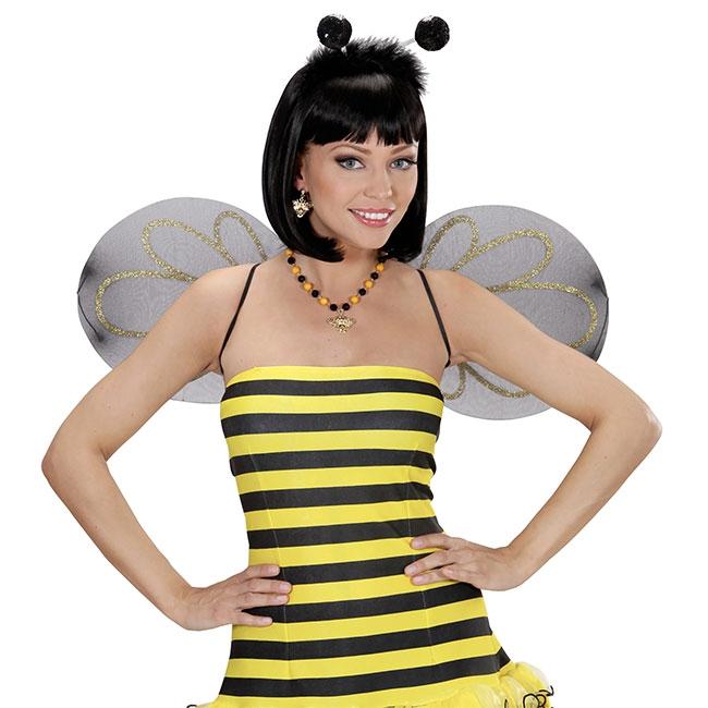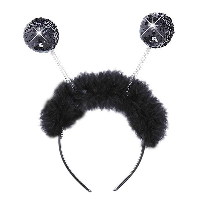 Dieser Haarreif besteht aus farbigem Kunststoff und trägt zwei Fühler aus Metallfedern mit einer glitzernden Pailletten Kugel. Zusätzlich sind am Haarreif farbige Federn befestigt. Er ist in den Farben rot, schwarz und gold erhältlich.