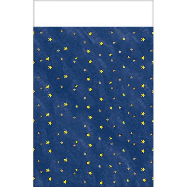 Die Tischdecke "Shining Star" besteht aus Papier und hat eine Größe von ca. 137 x 259 cm. Sie ist am Rand weiß und in der Mitte dunkelblau und mit vielen Sternen versehen.