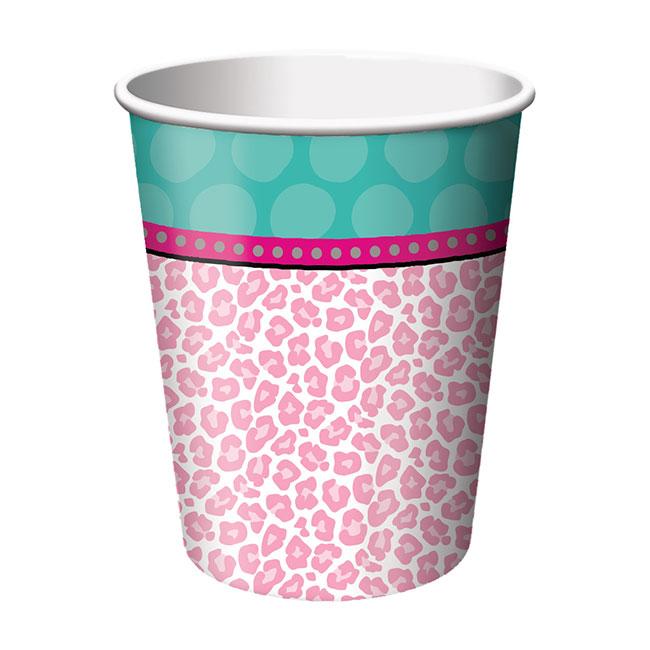Die Pappbecher "Beauty Accessoires" haben ein Fassungsvermögen von ca. 266 ml und werden im 8er-Pack geliefert. Im Gegensatz zum Rest der Serie sind die Becher nicht mit einem Motiv bedruckt, sondern greifen die verschieden farblichen Muster wie den pinken Leopardenprint und die mint-farbenen Kreise auf.