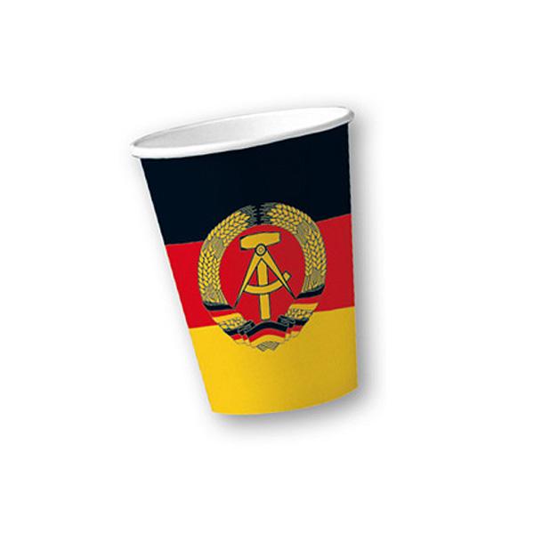 Die DDR, eine aufregende Zeit mit Höhen und Tiefen, doch man erinnert sich dennoch immer gerne zurück. Wenn man also eine Deutschland Party feiert bei der die DDR nicht vergessen werden darf, dann sind diese Pappbecher genau richtig. Sie werden im 10er Pack geliefert und haben eine Füllmenge von jeweils ca. 200 ml. Die Becher haben eine Höhe von ca. 10 cm und sind natürlich Schwarz-Rot-Gold gestreift. In der Mitte befindet sich das Wappen der DDR.