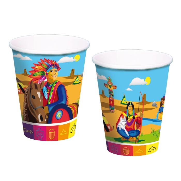 Zu einer Kinder-Geburtstagsparty oder einer Mottoparty mit dem Thema "Indianer" eignen sich diese kunterbunten Pappbecher. Bedruckt sind sie mit einem klassischen Indianerdorf, auf dem man einen Häuptling auf seinem Pferd sitzen sieht, eine Frau die Wasser sammelt sowie Zelte und Tiere. In den Becher passen ca. 250 ml hinein, also genug, um jeden durstigen Indianer strahlen zu lassen. Geliefert werden die Pappbecher im 8er Pack, passend dazu finden Sie in unserem Shop weitere Artikel.