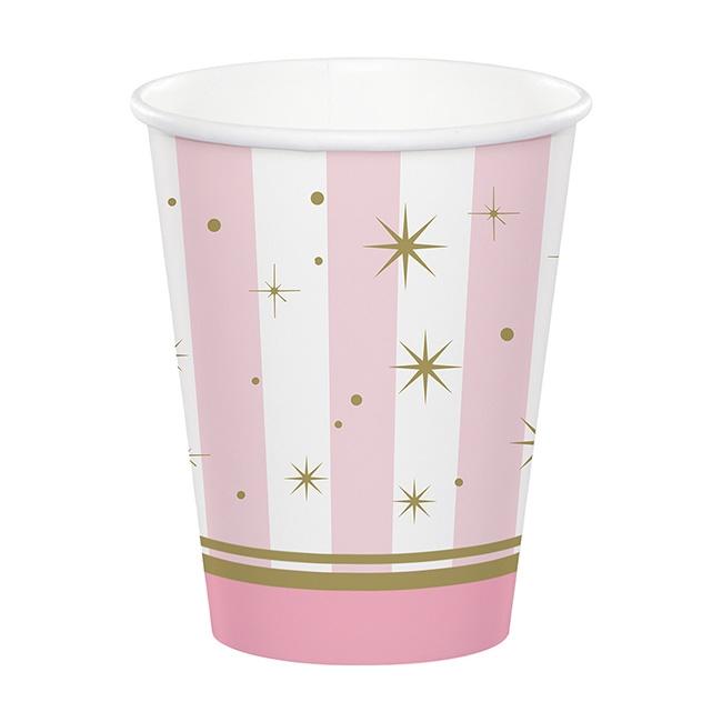 Die Pappbecher aus der Serie "Kleine Ballerina" werden im 8er Pack geliefert. Sie haben eine Höhe von ca. 9,4 cm und ein Fassungsvermögen von ca. 266 ml. Die Becher sind rundherum mit Streifen in den Farben Rosa und Weiß bedruckt. Zusätzlich zieren goldene Sterne und Punkte diese tollen Becher.