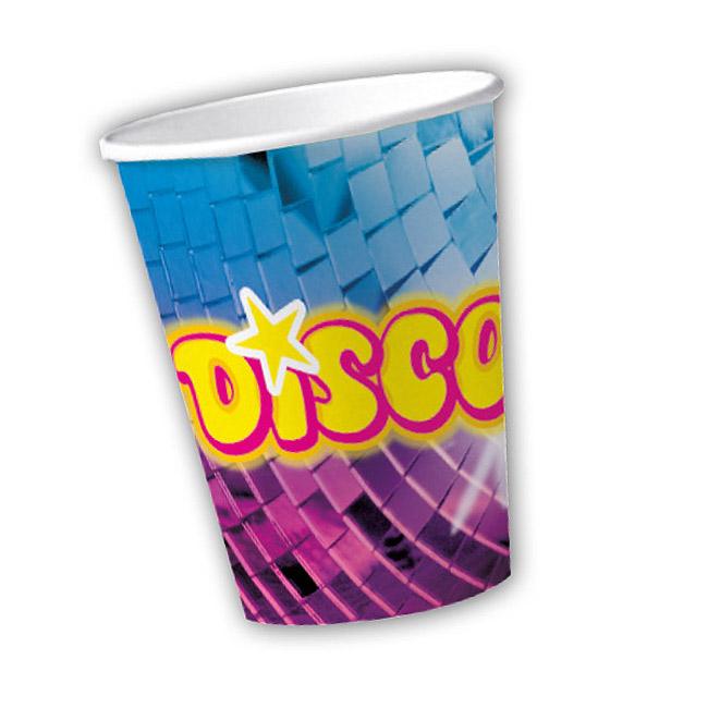 Mehr Info: Die Becher aus Pappe leuchten in schönen Farben. Im Hintergrund meint man eine Discokugel zu erkennen. Vorne ist in großer Schrift "Disco" bedruckt.
