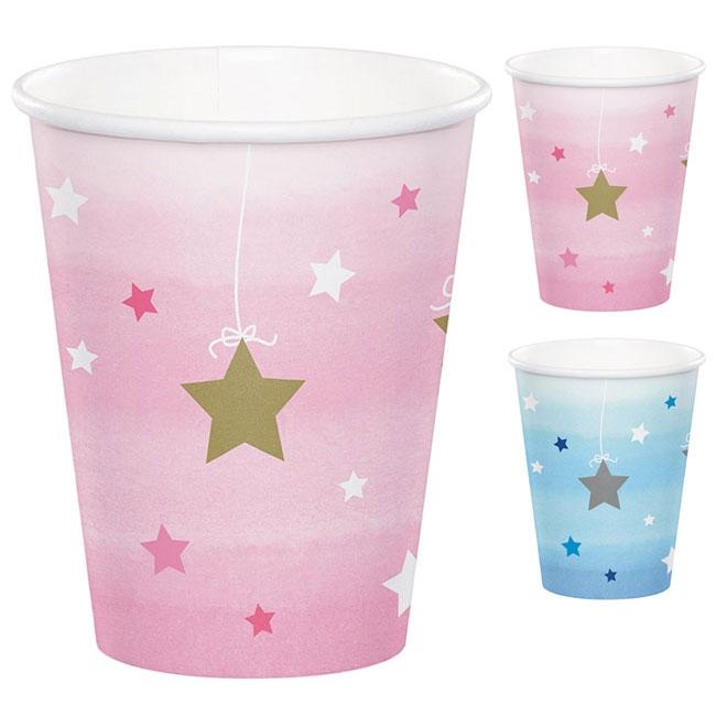 Die Pappbecher "Little Star" sind je nach Auswahl in der Farbe Blau oder Rosa erhältlich. Sie werden im 8er Pack geliefert und sind ca. 9,5 cm hoch. Das Fassungsvermögen beträgt ca. 266 ml. Je nach Farbauswahl ist das Design entweder in den Farben Blau und Silber, oder Rosa und Gold designet.