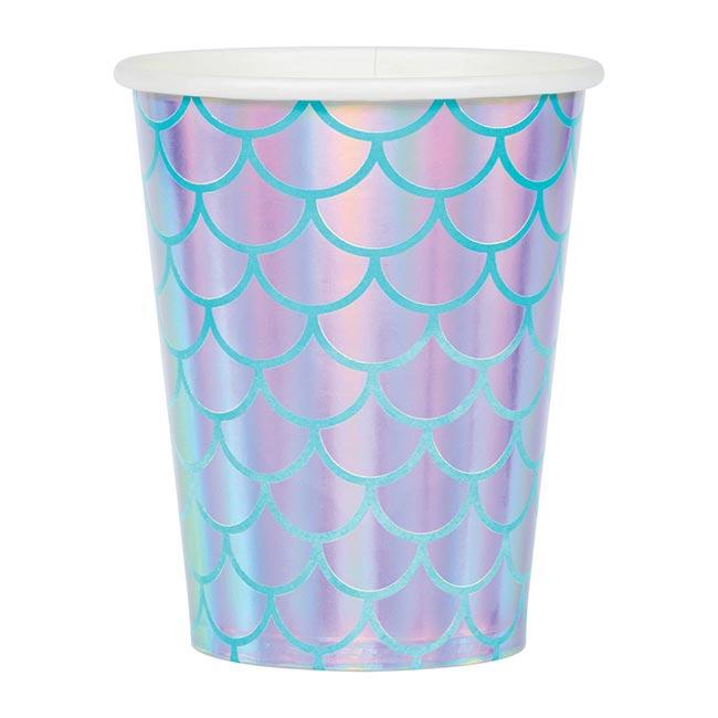 Die Pappbecher "Mermaids have fun" werden im 8er Pack geliefert und bestehen aus Pappe. Sie haben an der Oberkante einen Durchmesser von ca. 7,5 cm und eine Höhe von ca. 9,6 cm. Die Füllmenge der Pappbecher beträgt ca. 266 ml. Die silberfarbenen Becher sind mit einem türkisfarbenen Fischschuppenmuster bedruckt und schimmern je nach Lichteinfall irisierend.