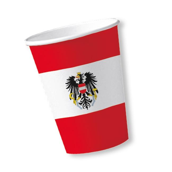Die Becher "Österreich" werden im 10er Pack geliefert. Sie bestehen aus Pappe, sind ca. 9,5 cm groß und haben ein Fassungsvermögen von ca. 0,2 Liter. Neben den Farben der österreichischen Flagge, ist auf den Bechern auch der Bundesadler abgebildet.