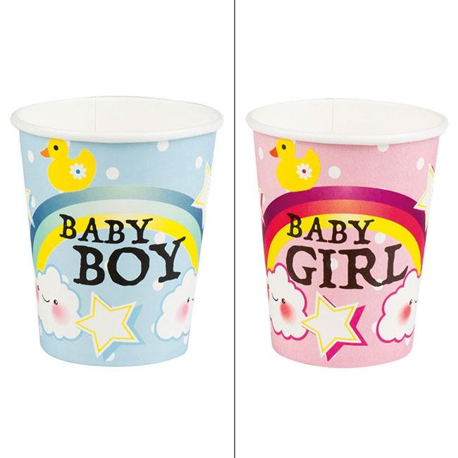 Die niedlichen Pappbecher aus der Serie "Schnulleralarm" werden im 6er Pack geliefert. Sie haben ein Fassungsvermögen von ca. 250 ml und sind ca. 9 cm hoch. Je nach Auswahl kann zwischen den Farben Rosa und Blau gewählt werden. Die Becher sind mit einem Regenbogen und kleinen Wolken, Sternchen und einer Badeente bedruckt. Je nach Ausführung sind die Becher mit Baby Boy (Blau) oder Baby Girl (Rosa) bedruckt.