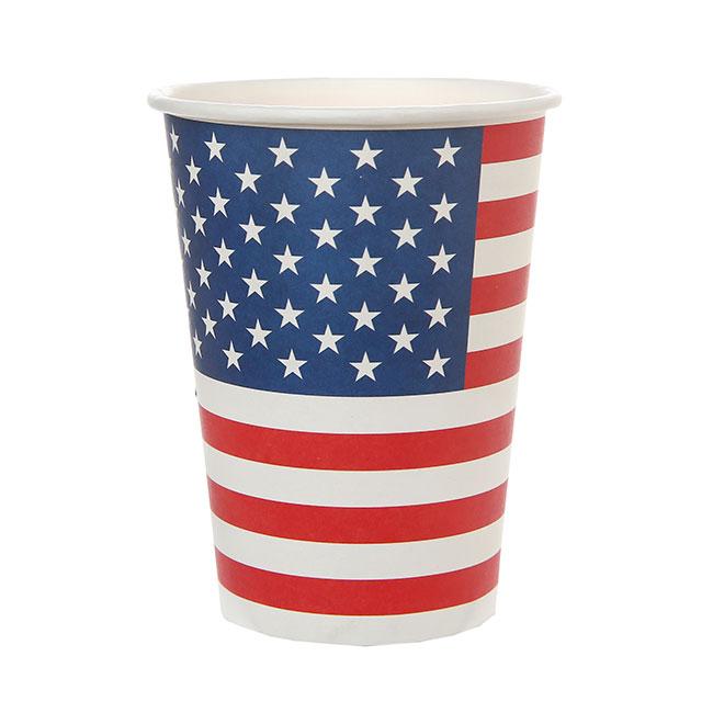 Die Pappbecher "United States of America" werden im 10er Pack geliefert. Sie haben eine Höhe von ca. 11 cm und einen Durchmesser von ca. 7,5 cm. Bedruckt sind sie mit der US-amerikanischen Flagge.
