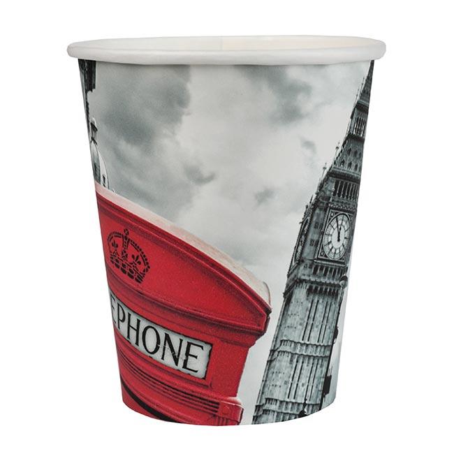 Die ca. 9,5 cm hohen Pappbecher "Weltstadt London" werden im 10er Pack geliefert. Sie haben am oberen Rand einen Durchmesser von ca. 7,5 cm. Das schwarzweiße Fotomotiv zeigt unter anderem den Big Ben. Eine rote britische Telefonzelle sticht besonders hervor.
