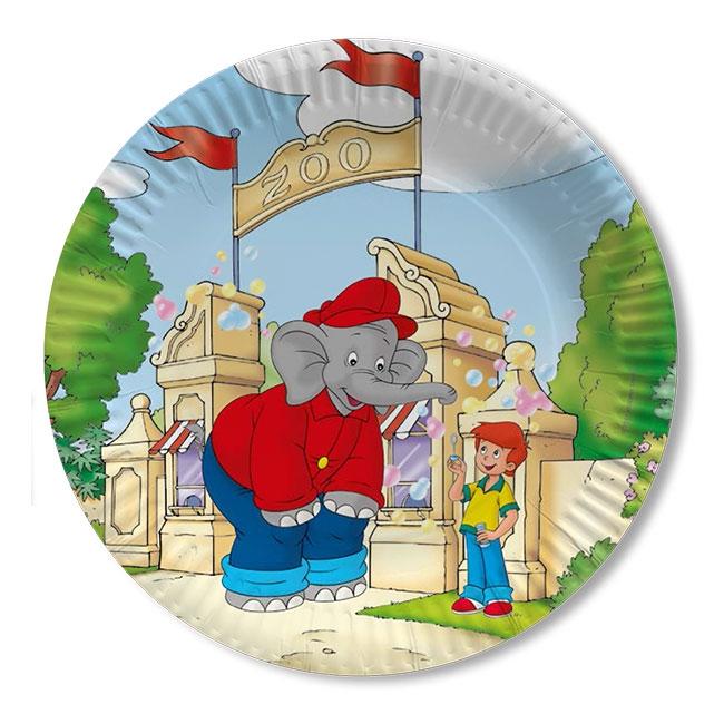 Die Pappteller "Benjamin Blümchen" werden im 8er Pack geliefert und haben einen Durchmesser von ca. 22,5 cm. Auf den Tellern sind Otto und Benjamin abgebildet, wie sie Seifenblasen pusten. Im Hintergrund ist der Eingang des Zoos zu sehen.