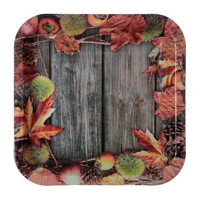 Die farbenfrohen Pappteller "Bunter Herbst" werden im 10er Pack geliefert. Sie sind quadratisch und messen ca. 22,5 x 22,5 cm. Das einseitig aufgedruckte Motiv zeigt Holzbalken, buntes Laub, Kastanien, Nüsse und vieles mehr.