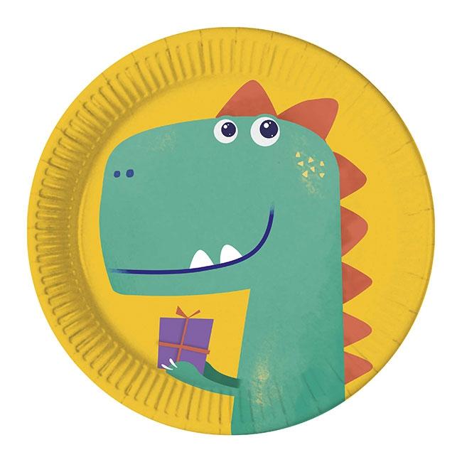 Die Pappteller Dino Roar werden im 8er Pack geliefert und weisen einen Durchmesser von ca. 22,5 cm auf. Sie sind gelb und mit einem lächelnden Dino bedruckt, der ein hübsch verpacktes Geschenk hält.