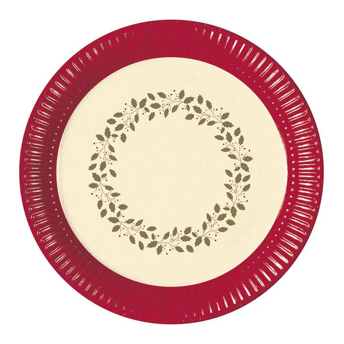 Die Pappteller "Goldene Weihnachtszeit" werden im 8er Pack geliefert und haben einen Durchmesser von ca. 23 cm. Passend zu Weihnachten, ist der Rand des Tellers in einem weihnachtlichen Rot gehalten. Die beige Mitte ist mit goldenen Stechpalmenzweigen, und den typischen roten Beeren bedruckt.