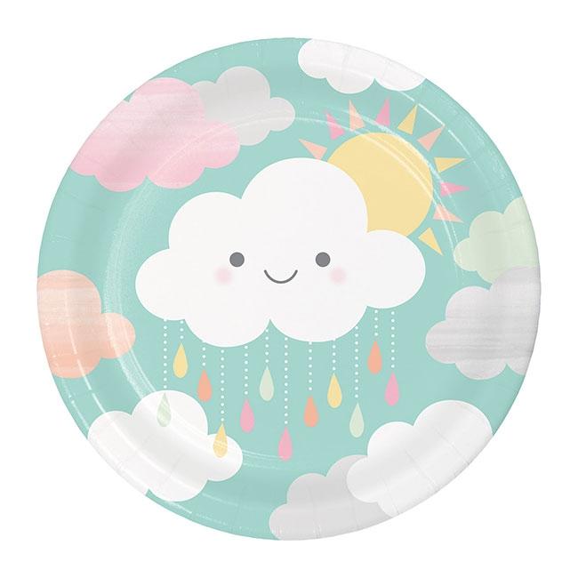 Auf die Pappteller "Kleiner Sonnenschein" geht eine ganze Menge drauf. Sie werden im 8er Pack geliefert und haben einen Durchmesse von ca. 22 cm. Bedruckt sind die Teller wieder mit einer lachenden, kleinen Regenwolke.