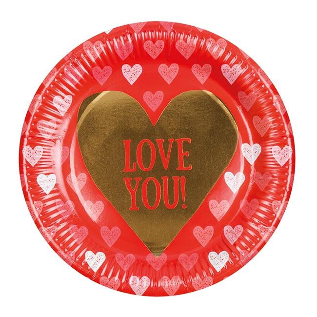 Die Pappteller "Love You" haben einen Durchmesser von ca. 26 cm und werden im 6er Pack geliefert. Farblich sind sie überwiegend rot gestaltet und in der Mitte mit einem schimmernden, goldfarbenen Herz bedruckt. Auf diesem ist "Love you!" zu lesen. Um dieses Herz herum befinden sich viele weitere kleine Herzchen in den Farben Weiß und Rosa.