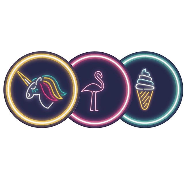 Die Pappteller aus unserer Serie Neon sind ganz im Stil toller Retro Neonreklamen designet. Sie haben einen Durchmesser von ca. 22 cm und sind einseitig bedruckt. Pro Packung sind 3 verschiedene Designs in unterschiedlicher Sortierung enthalten. Die Motive zeigen eine Eistüte, einen Einhornkopf oder einen Flamingo. Der Rand ist farblich abgestimmt und ebenfalls im Stil einer Leuchtstoffröhre designet.