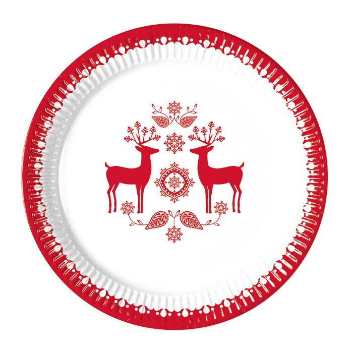 Die Pappteller "Niedliche Rentiere" werden im 8er Pack geliefert, der Durchmesser beträgt ca. 22,5 cm. Zu sehen sind zwei rote Rentiere auf weißem Grund. Verschnörkelte Geweihe, Blätter, Blumen und andere Muster wirken besonders detailliert und hübsch gestaltet. Zusätzlich wird das Motiv von einem roten Rand umrahmt.