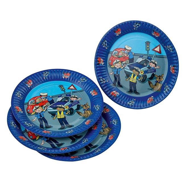 Die Pappteller "Polizei im Einsatz" werden im 8er Pack geliefert und haben einen Durchmesser von ca. 23 cm. Sie sind blau umrandet und zeigen in der Mitte die Polizei bei der täglichen Arbeit. Sogar ein niedlicher Diensthund ist dabei!