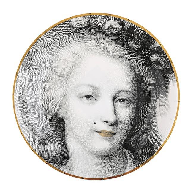 Die Pappteller "Royales Fest" haben einen Durchmesser von ca. 22,5 cm und werden im 10er Pack geliefert. Je nach Auswahl kann beim Dekor zwischen König oder Königin gewählt werden. Historische Zusammenhänge sind hier rein zufällig, und doch vielleicht ein bisschen gewollt. Die Motive sind im Stil eines Kupferstichs gehalten und jeweils noch mit einem glänzenden, goldenen Rand versehen.