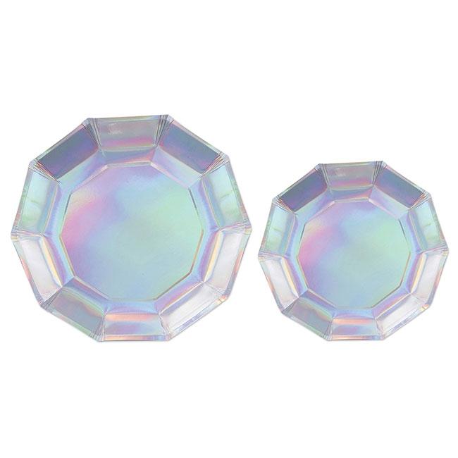 Die Pappteller der Serie "Schillernde Pracht" sind in zwei Grßen verfügbar und werden jeweils im 8er Pack versendet. Sie haben eine zehneckige Form, ein Decagon. Dieses ist schillernd und rekleftiert Licht und Bilder. Der kleine Teller hat einen Durchmsser von ca. 18 cm, der Große etwa 23 cm.