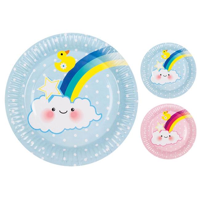 Die Pappteller "Schnulleralarm" werden im 6er Pack geliefert. Sie haben einen Durchmesser von ca. 23 cm. Je nach Auswahl sind sie in den Farben Rosa oder Blau erhältlich. Die Teller sind mit einem Regenbogen, einem lachenden Wölkchen und einem Badeentchen bedruckt.