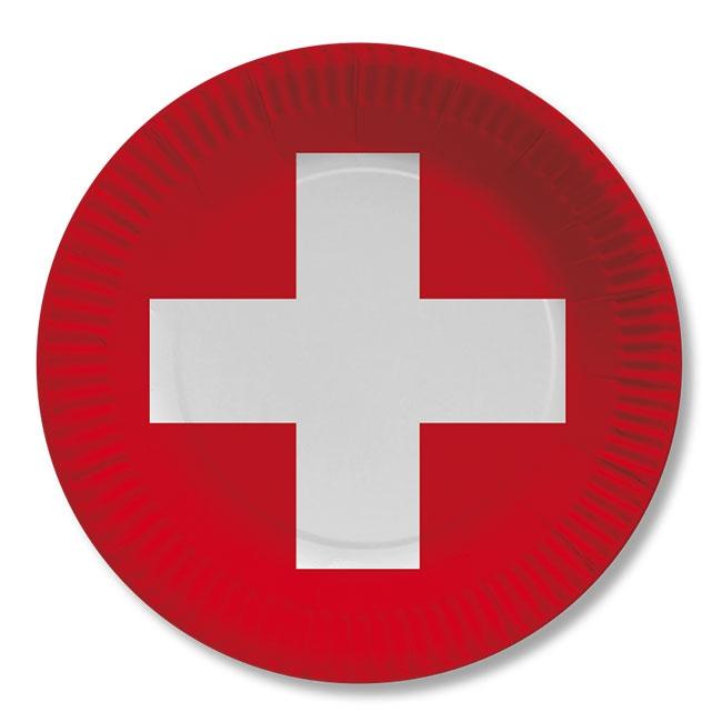 Die Pappteller "Schweiz" werden im 10er Pack geliefert und haben einen Durchmesser von ca. 23 cm. Sie sind einseitig mit der Schweizer Flagge bedruckt.