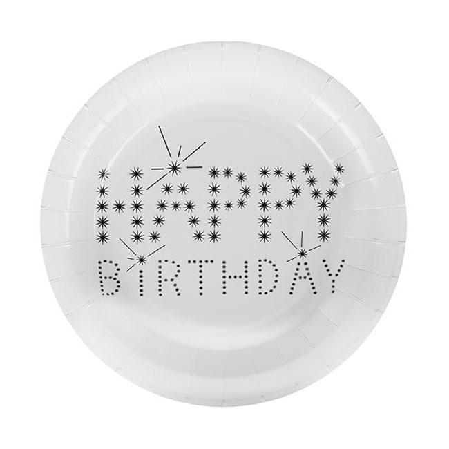 Die Pappteller "Sparkling Birthday" werden im 10er Pack geliefert und haben einen Durchmesser von ca. 22,5 cm. Sie sind hauptsächlich weiß und zeigen kleine schwarze Sterne, die funkelnd den Schriftzug "Happy Birthday" ergeben.