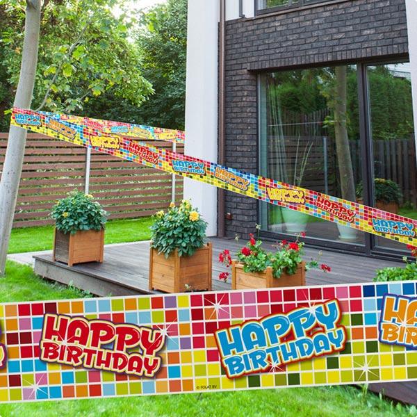 Mit diesem Party-Absperrband kann der Geburtstag starten! Hier weiß jeder wer die Party Location betreten darf und wer nicht. Das Absperrband aus Folie hat eine Länge von ca. 7 Meter und kann im Garten, vor der Haustüre oder im Flur dekoriert werden. Es hat eine Höhe von ca. 8 cm und ist mit bunten viereckigen kleinen Flächen bedruckt. In regelmäßigen Abständen steht auf dem Absperrband "Happy Birthday". So weiß jeder dass es ein Geburtstagskind gibt!